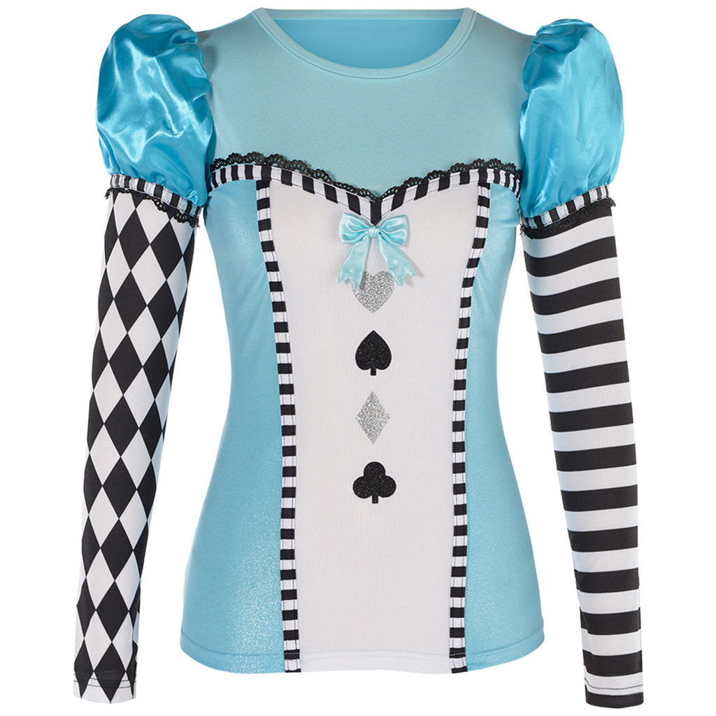 - Blue ruffle shorts with white lace-trimmed apron for classic Alice styling